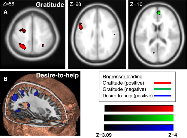 La operacionalización de la gratitud como regalos monetarios nos permitió a los investigadores involucrar a los sujetos y cuantificar la expresión de gratitud para los análisis posteriores. Se midió la actividad cerebral y se encontraron regiones donde la actividad se correlacionaba con la experiencia de gratitud auto-informada durante la tarea, incluso incluyendo construcciones relacionadas como la motivación por culpa y el deseo de ayudar como controles estadísticos.