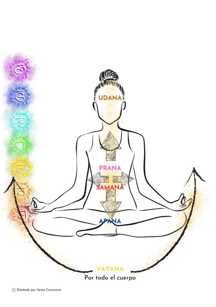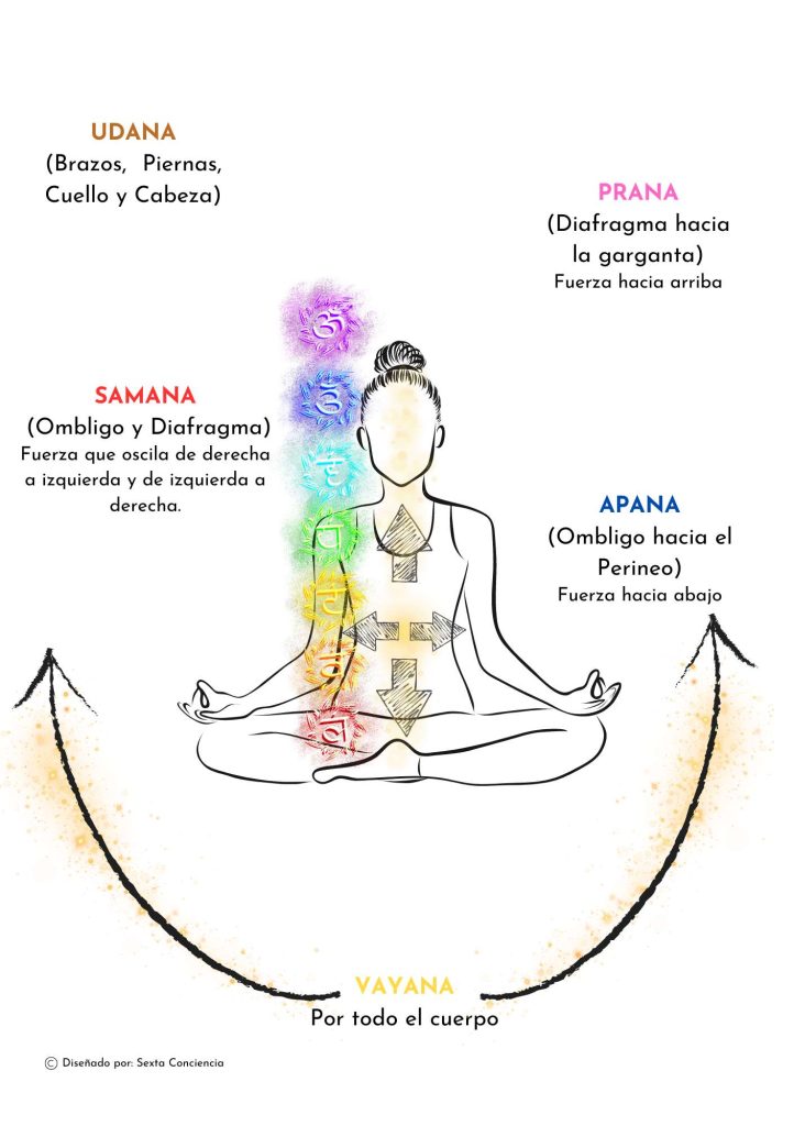 Los cinco Pranas: Prana, Apana, Udana, Vyana y Samana.